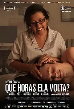 Que Horas Ela Volta? é um filme brasileiro de 2015, do gênero drama, escrito e dirigido por Anna Muylaert. O filme é protagonizado por Regina Casé e trata dos conflitos que acontecem entre Val, uma empregada doméstica do Brasil e seus patrões de classe média alta, criticando as desigualdades da sociedade brasileira.[3]