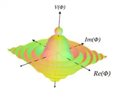 Um exemplo com simetria contínua é dado por um análogo 3d do exemplo anterior, ao se rotacionar o gráfico em torno de um eixo através do topo da colina. A superfície obtida é dada igualmente pelo gráfico de . Esse é, essencialmente, o gráfico do potencial do chapéu mexicano. O gráfico possui uma simetria contínua dada pela rotação em torno do eixo através do topo da colina (bem como uma simetria discreta por reflexão através de qualquer plano radial). Novamente, se a partícula está no topo da colina ela é fixada em rotações, tendo porém, maior energia gravitacional. No fundo, não é mais invariante sob rotações, mas minimiza sua energia potencial gravitacional. Além disso, as rotações movem a partícula de uma configuração de minimização de energia para outra. Há uma novidade aqui, não vista no exemplo anterior: a partir de qualquer um dos estados de vácuo é possível acessar qualquer outro estado de vácuo com apenas uma pequena quantidade de energia, movendo-se ao redor da calha na base da colina. Já no exemplo anterior, para acessar o outro vácuo a partícula teria que atravessar o topo do gráfico, o que exige uma enorme quantidade de energia.