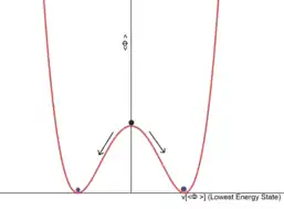 Um exemplo de sistema com simetria discreta pode ser dada pela figura com a curva do gráfico vermelha: considere uma partícula movendo-se nesta curva, sujeita à ação da gravidade. Um gráfico semelhante poderia ser obtido pela função . Este sistema é simétrico sob reflexão no eixo y. Existem, portanto, três possíveis estados estacionários para a partícula: o topo da colina em , ou na parte inferior, em . Quando a partícula está no topo a configuração respeita a simetria da reflexão: a partícula fica no mesmo lugar quando refletida. Porém, as configurações de menor energia são aquelas em (onde a partícula apresenta menor energia potencial gravitacional). Quando a partícula está em qualquer uma dessas configurações, ela não está mais fixa sob reflexão no eixo y, ou seja, a reflexão troca os dois estados de vácuo.