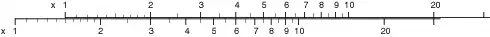 O próximo esquema mostra as escalas C e D posicionadas para uma multiplicação por 1,5, veja que qualquer valor lido na escala C (a de cima), resultará automaticamente neste valor multiplicado por 1,5 na escala D (a de baixo).