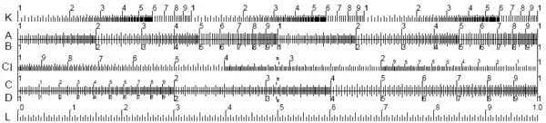 A régua de cálculo é composta por dois tipos de escalas: as fixas e as móveis, e em cada uma destas partes estão distribuídas as várias possíveis escalas. Quase sempre as escalas mostradas na figura ao lado estão presentes em todas as réguas. Estas são as principais escalas mas, no entanto, existem muitas outras, inclusive há réguas que possuem diversas partes móveis com escalas diferentes que podem ser intercambiadas na parte fixa para expandir as possibilidades de cálculos, por exemplo na régua ao lado não existe a escala S que faz cálculos com senos, assim poderíamos tirar a parte móvel (composta, no caso, pelas escalas B, CI e C), e colocar uma outra que contivesse a escala S que em conjunto com a escala D permite cálculos de seno.