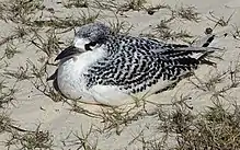 Os pintinhos recém-nascidos são cobertos por uma penugem fina, longa e cinza-esbranquiçada, que é mais clara na cabeça. A penugem é mais grisalha em pintinhos mais velhos. Os pintinhos sua maioria têm penas residuais nas partes inferiores e sob as asas após seis semanas, e se tornam totalmente emplumados por 11 semanas. [20] Aves juvenis têm testa, queixo, garganta e parte inferior de um branco brilhante,[19] e barragens e escamas pretas proeminentes na coroa, nuca, manto, dorso, nádega e na asa superior. [18] Seus bicos são cinza-escuro com base cinza-azulada clara e pernas e pés cinza [19]