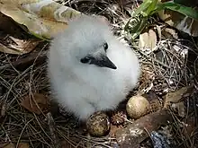 Nascidos indefesos e incapazes de se mover (nidícolas e semialtriciais), os pintinhos são inicialmente cegos, abrindo os olhos após 2–3 dias. Até a idade de uma semana, eles abrem o bico apenas ao toque, então os pais têm que acariciar a base do bico para iniciar a alimentação. A alimentação ocorre uma ou duas vezes ao dia, geralmente por volta do meio-dia. Eles são constantemente ciuidados pelos pais até a idade de uma semana, após o que são protegidos sob as asas dos pais. Eles também se levantam e ficam de bico aberto com qualquer pássaro próximo para se alimentar. [20] Ambos os pais alimentam os filhotes,[36] enfiando o bico no do filhote e regurgitando a comida.[43] Cobertos inicialmente com penugem cinza ou branca, eles crescem suas primeiras penas - escapulários - aos 16-20 dias. Seus pés e bicos crescem rapidamente, ultrapassando o resto de seus corpos.[20] Filhotes permanecem no ninho por 67 a 91 dias até emplumar.[37]