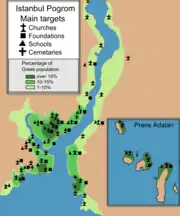 Medidas exclusivistas nacionalistas turcas punitivas, como uma lei parlamentar de 1932, impediram os cidadãos gregos que viviam na Turquia de uma série de 30 operações e profissões como nas áreas de alfaiataria, carpintaria, medicina, direito e imóveis.[129] O imposto Varlık Vergisi imposto em 1942 também serviu para reduzir o potencial econômico dos empresários gregos na Turquia.[130] De 6 a 7 de setembro de 1955 Pogrom de Istambul, tumultos anti-gregos foram orquestrados em Istambul pelo Grupo de Mobilização Tática dos militares turcos, sede da filial turca da Operação Gladio; o contra-guerrilheiro. Os eventos foram desencadeados pelas notícias de que o consulado turco em Thessaloniki, norte da Grécia - a casa onde Mustafa Kemal Atatürk nasceu em 1881 - havia sido bombardeado no dia anterior. Uma bomba plantada por um promotor turco do consulado, que mais tarde foi preso e confessado, incitou os eventos. A imprensa turca que transmitia as notícias na Turquia ficou em silêncio sobre a prisão e, em vez disso, insinuou que os gregos haviam disparado a bomba. Embora a multidão não tenha pedido explicitamente que os gregos fossem mortos, mais de uma dúzia de pessoas morreu durante ou após o pogrom como resultado de espancamentos e incêndios criminosos. Judeus, armênios e muçulmanos também foram prejudicados. Além dos alvos comerciais, a multidão visava claramente propriedades pertencentes ou administradas pela Igreja Ortodoxa Grega. 73 igrejas e 23 escolas foram vandalizadas, queimadas ou destruídas, assim como 8 asperses e 3 mosteiros.