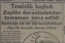 O massacre de Zilan em 1930[154] foi um massacre dos residentes curdos da Turquia durante a rebelião de Ararat, na qual participaram de 800 a 1500 homens armados. Segundo o diário Cumhuriyet, datado de 16 de julho de 1930, cerca de 15.000 pessoas foram mortas e o rio Zilan estava cheio de cadáveres até a boca. Em 31 de agosto de 1930, o diário Milliyet publicou a declaração do primeiro-ministro turco İsmet İnönü : "Somente a nação turca tem o direito de exigir direitos étnicos e raciais neste país. Qualquer outro elemento não tem esse direito. Eles são turcos orientais que foram enganados por propaganda infundada e eventualmente se perderam. "