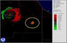Um exemplo é mostrado na imagem à direita, mostrando a queda de meteoritos no Park Forest, IL que ocorreu em 26 de março de 2003. As características vermelho/verde no canto superior esquerdo são o deslocamento de nuvens perto do próprio radar e uma assinatura de meteoritos em queda é vista dentro da elipse amarela no centro da imagem. Os pixels vermelhos e verdes entrelaçados indicam turbulência, neste caso decorrente da queda de meteoritos de alta velocidade.