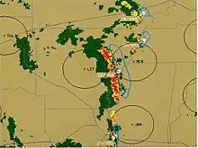 - Detecção de mesociclones: é desencadeada por uma mudança de velocidade em uma pequena área circular. O algoritmo estará procurando um par de velocidades de entrada/saída com a linha zero de velocidade, entre os dois, ao longo de uma linha radial do radar. Normalmente, a detecção do mesociclone deve ser encontrada em duas ou mais inclinações progressivas empilhadas do feixe para ser significativa na rotação de uma nuvem de tempestade.