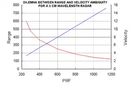 A escolha se torna aumentar o alcance da refletividades às custas do alcance da velocidade, ou aumentar o alcance da velocidade às custas do alcance da refletividade. Em geral, o intervalo de alcance útil é 100–150 km para a refletividade. Isso significa, para um comprimento de onda de 5 cm (como mostrado no diagrama), um intervalo de velocidade desambígua de 12,5 a 18,75 metros/segundo é produzido (para 150 km e 100 km, respectivamente). Para um radar 10 cm como o NEXRAD,[6] o alcance da velocidade desambígua seria dobrado.