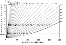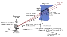 Sendo a Terra redonda, o feixe de radar no vácuo aumentaria de acordo com a curvatura inversa da Terra. No entanto, a atmosfera tem um índice de refração que diminui com a altura, devido à sua densidade decrescente. Isso dobra o feixe de radar ligeiramente em direção ao solo e com uma atmosfera padrão isto é equivalente a considerar que a curvatura do feixe é 4/3 a curvatura real da Terra. Dependendo do ângulo de elevação da antena e outras considerações, a seguinte fórmula pode ser usada para calcular a altura do alvo acima do solo: