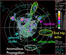 O retorno do radar costuma ser descrito por cor ou nível. As cores em uma imagem de radar normalmente variam de azul ou verde, para o retorno fraco, ao vermelho ou magenta para o retorno muito forte. Os números em um relatório verbal, aumentam com a severidade do retorno. Por exemplo, o U.S. National Doppler Radar usa a seguinte escala para os diferentes níveis de refletividade:[2]