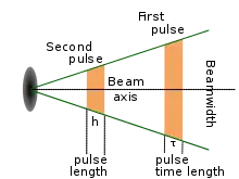 O volume de ar que um determinado pulso ocupa em qualquer ponto no tempo pode ser aproximado pela fórmula . Onde v é o volume abraçado pelo pulso, h é a largura de pulso (em metros, calculada a partir da duração em segundos do pulso vezes a velocidade da luz), r é a distância desde o radar que o pulso já percorreu em metros, por exemplo, e é a largura do feixe (em radianos). Esta fórmula assume que o feixe é simetricamente circular, "r" é muito maior do que "h" então "r" tomada no início ou no final do pulso é quase a mesma, e a forma do volume é um cone de profundidade "h".