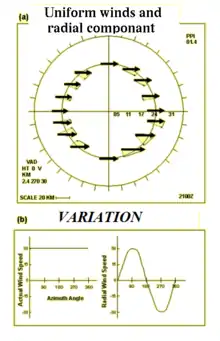 Em uma tempestade uniforme se movendo para leste, o feixe da radar apontando para oeste “verá” as gotas de chuva se movendo em sua própria direção, enquanto que o feixe apontado para leste “verá” as gotas se afastando. Quando o feixe está apontado para norte ou para sul, nenhum movimento radial relativo é percebido.[6]