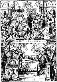 ![]() A Rainha e o Rei de Copas, no julgamento do Valete de Copas, ilustador por John Tenniel. | |