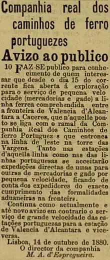 Em 15 de Outubro de 1879 entrou ao serviço o lanço em território português, de forma provisória, e apenas para serviços de pequena velocidade, tendo a linha sido oficialmente inaugurada em 6 de Junho de 1880.[1][15] Para a construção deste troço junto a Vale do Peso, foi necessário demolir parte da Ermida de Santa Eulália, o que gerou uma tentativa de embargo das obras por parte da junta da paróquia, sem sucesso.[15] No dia 22 de Novembro de 1880, uma reunião em Paris deliberou que a Sociedad de los Ferrocarriles de Cáceres a Malpartida y a la frontera portuguesa seria totalmente dissolvida, e que a Compañia del Ferrocarril del Tajo seria integrada numa nova companhia, que seria responsável por ambas as linhas.[16] Esta empresa foi constituída no dia 7 de Dezembro do mesmo ano, em Madrid, com o nome de Compañia del Ferrocarril de Madrid a Cáceres y Portugal.[10] Entretanto, o lanço entre Valência de Alcântara e Cáceres entrou ao serviço em 15 de Outubro do mesmo ano.[12][10]