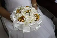 Antigamente, as noivas confeccionavam dois arranjos. Um era abençoado por um sacerdote e preservado numa redoma de vidro que era exposto na sala de casa ou no quarto. O outro era arremessado para as mulheres solteiras da festa, sendo dessa maneira a próxima a se casar, ritual que é realizado até hoje nas cerimônias.[2][3]