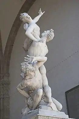 A escultura de Giambologna (1574–1583) que foi interpretada como abordando este tema mostra três figuras (um homem que levanta uma mulher no ar, enquanto um segundo homem se agacha) e foi esculpida a partir de um único bloco de mármore. A obra, que é tida como a obra-prima de Giambologna,[5] tinha originalmente como intenção ser apenas uma demonstração da capacidade do artista de criar um grupo escultural complexo; seu tema, o lendário rapto das sabinas, foi associado a ela apenas após Francisco I de' Medici, Grão-Duque da Toscana, decretou que ela seria exposta na Loggia dei Lanzi, na Piazza della Signoria, em Florença. Mantendo-se de acordo com as características típicas das composições maneiristas, como figuras compactas e entrelaçadas, a estátua transmite uma panóplia dinâmica de emoções, em poses que oferecem pontos de vista múltiplos. Contrastada com a pose serena do Davi de Michelangelo que está na mesma praça, concluído quase 80 anos antes, a estátua apresenta a dinâmica que acabou por levar a arte europeia da época ao barroco, porém também a verticalidade pouco flexível e desconfortável — auto-imposta pela restrição virtuosa do próprio autor a uma composição que podia ser feita a partir de um único bloco — e não apresenta os impulsos diagonais que Bernini conseguiria obter quarenta anos depois com obras como O Rapto de Proserpina e Apolo e Dafne, ambas na Galeria Borghese, em Roma.