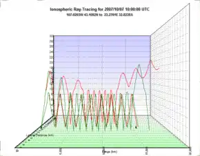 Uma forma particular de ray tracing é o rádio de sinal de traçamentos de raios, que traça sinais de rádio que são modelados como raios, através da ionosfera onde eles são refratada e/ou refletida de volta para a Terra. Esta forma de ray tracing envolve a integração de equações diferenciais que descrevem a propagação de ondas eletromagnéticas através de meios dispersivo e anisotrópica , tais como ionosfera. Um exemplo do sinal de traçamentos de raios de rádio é mostrado à direita. Comunicadores de rádio usar o este sistema para ajudar a determinar o comportamento exato de sinais de rádio e como eles se propagam através da ionosfera.