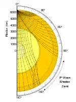 Em sismologia, geofísicos usam o ray tracing para ajudar na localização de terremoto e tomografia computadorizada para a reconstrução do interior da terra.[2][3] A velocidade da onda sísmica varia dentro e abaixo da crosta da Terra, fazendo com que estas ondas se dobram e refletem. Ray tracing pode ser usado para calcular caminhos através de um modelo geofísico, seguindo-as de volta à sua fonte, como um terremoto, ou deduzir as propriedades do elemento interferente.[4] Em particular, a descoberta de que a zona de sombra sísmica (ilustrado à direita) permitiu aos cientistas deduzir a presença de núcleo derretido da Terra.