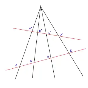 - A razão anarmônica é preservada por transformações projetivas. No caso, as razões anarmônicas são iguais: (A; B; C; D) = (A'; B'; C'; D')