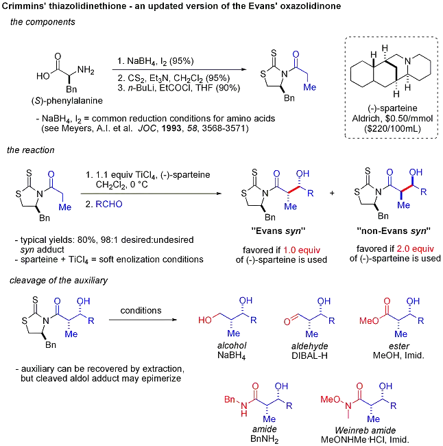 Uma versão do auxiliar de Evans, apresentada em 1997 é a tiazolidinetiona de Crimmins.[59][60] Os rendimentos, diastereosseletividades, e enantiosseletividades da reação são, em geral, altos, embora não tão altos como em casos de Evans comparáveis. Ao contrário do auxiliar de Evans, a tiazoldinetiona pode realizar reações aldólicas de acetato e pode produzir os adutos "Evans sin" ou "não-Evans sin" simplesmente pela variação da quantidade de (−)-esparteína.[61] Acredita-se que a reação proceda via estados de transição ligados a titânio de seis membros, análogos aos propostos estados de transição para o auxiliar de Evans.Note-se que a estrutura da esparteína mostrada abaixo apresenta a falta de um átomo de nitrogênio (N).