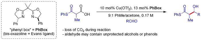 Em desenvolvimento apresentado no ano de 2005, uma abordagem biomimética por Shair usa beta-tiocetoácidos como nucleófilo.[72] A estrutura cetoácido é decarboxilada in situ. O processo é similar à rota malonil-CoA é usado por policétido sintases. O ligando quiral é no caso uma bisoxazolina. Curiosamente, aldeídos alifáticos aromático e ramificado são tipicamente substratos pobres.