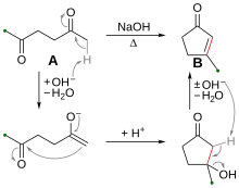 O mecanismo da reação aldólica intramolecular envolve a formação de um intermediário enolato chave e um processo de adição nucleofílica intramolecular. Primeiro, o hidróxido remove o hidrogênio α no carbono 6 para formar o enolato. A seguir, ataque nucleofílico ao carbono 2 da cetona pelo enolato forma a ligação carbono-carbono entre carbonos 2 e 6. Finalmente, geralmente sob condições de aquecimento, a eliminação de moléculas de água forma a cetona α,β-insaturada.
