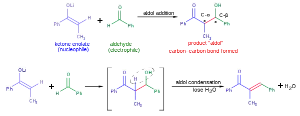 A reação consiste no ataque nucleofílico envolvendo dois compostos contendo carbonilo, um enolato de um aldeído ou cetona sobre o carbonilo de outra molécula de aldeído ou cetona para formar um novo composto β-hidroxialdeído (um composto β-hidróxi carbonilo), ou, como estes compostos são conhecidos, "aldol" (de aldeído + álcool), ou uma β-hidroxicetona (os experimentos originais usavam aldeídos).[8][9][10][11] Por exemplo, a reação aldólica tem sido usada na produção em larga escala da commodity química pentaeritritol[12] Se o produto da adição aldólica perde uma molécula de água (desidrata) o produto final é um aldeído ou cetona α,β-insaturada. Isto se conhece como condensação aldólica.