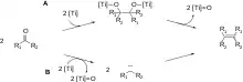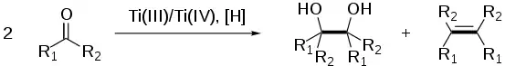 Ambas as publicações seminais de Mukaiyama e Tyrlik apresentavam sugestões para o mecanismo reaccional da reacção, apesar de distintas. A primeira, sugeria a passagem por um intermediário do tipo pinacolato que subsequentemente, pela eliminação de oxidos de titânio generaria o alceno desejado. Por este mecanismo a geração dos 1,2-diois é explicada pela hidrolise básica do tratamento final da reacção. A segunda avançava que a espécie activa de titânio eliminaria um oxido de titânio inicialmente dando origem a um carbeno livre, que dimerizaria para o alceno.