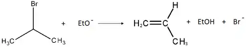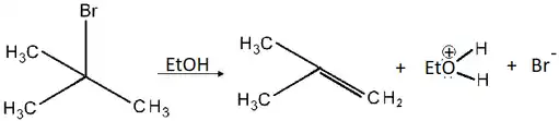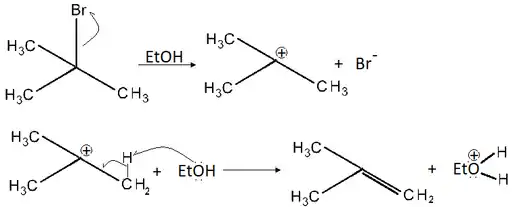 Essa reação envolve duas etapas sendo que, primeiramente, é formado um carbocátion que, em seguida, tem o próton do carbono beta removido, gerando, assim, uma ligação múltipla. Um exemplo desse tipo de reação pode ser visto abaixo:[3][2]