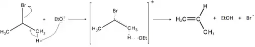 Nessa reação, a base ataca um próton do carbono beta , sendo que, ao mesmo tempo, é removido o halogênio contido na molécula, isso faz com que a reação não possua nenhum intermediário. Um exemplo desse tipo de reação pode ser visto abaixo:[2]