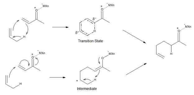Como visto na Figura 11, reações eno catalisadas por ácido de Lewis pode prosseguir através de um mecanismo concertado que tenha um estado de transição polar, ou através de um mecanismo gradual com um intermediário zwitteriônico. O eno, enófilo e escolha de catalisador podem todos influenciar qual rota é o processo de menor energia. Em geral, o complexo eno ou enófilo-ácido de Lewis mais reativo é mais provável que seja a reação gradual.[3]
