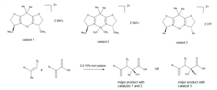 Evans e colaboradores[16] criaram um novo tipo de catalisadores C2-simétrico Cu(II) enantiosseletivos aos quais substratos podem quelar através de dois grupos carbonilo. Os catalisadores foram encontrados fornecendo altos níveis de indução assimétrica em vários processos, incluindo uma reação eno de glioxilato de etila com diferentes olefinas inativadas. Figura 15 apresenta os três catalisadores que eles encontraram como sendo os mais efetivos em fornecer ésteres alfa-hidroxi gama-delta-insaturados em altos rendimentos e enantiosseletividades excelentes. O que é especial sobre o composto 2 é que é estável e pode ser armazenado indefinidamente, tornando-se conveniente de ser usado. A reação tem um vasto escopo, como mostrado na Figura 16, devido a alta acidez de Lewis dos catalisadores, que pode ativar até mesmo olefinas nucleofílicas fracas, tais como 1-hexeno e cicloexeno.