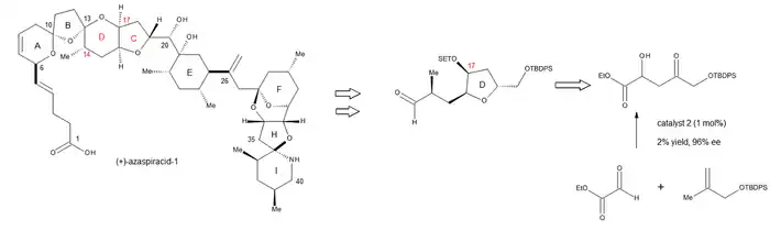 A utilidade sintética dos catalisadores C2-simétricos Cu(II) quirais foi verdadeiramente revelado na formação do estereocentro C17 do fragmento de anel CD da (+)-azaspiracida-1, uma toxina muito potente (citotóxica à células de mamíferos) produzido em pequenas quantidades por múltiplas espécies de mariscos, incluindo mexilhões, ostras, vieiras, amêijoas e berbigões.[19] Como mostrado na Figura 19, a reação que estabelece o estereocentro C17 é catalisada por 1 mol % de complexo Cu(II) 2 (Figura 15), e os autores notaram que pode ser conduzida em uma escala de 20 g e ainda resultar em rendimentos muito bons e excelentes enantiosseletividades. Além disso, o produto pode ser facilmente convertido na correspondente amida de Weinreb, sem qualquer perda de seletividade, permitindo a introdução fácil do grupo metilo de C14. Assim, este novo processo catalítico enantiosseletivo desenvolvido por Evans e colaboradores pode ser facilmente integrado em projetos complexos de síntese, especialmente no início de sínteses, quando altos rendimentos e enantiosseletividades são de extrema importância.