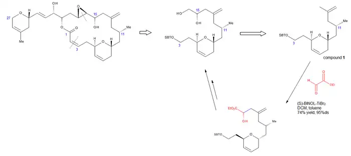 A síntese total formal de laulimalida [15] (Figura 14) ilustra a robustez da reação desenvolvida por Mikami. Laulimalida é um produto natural marinho, um metabólito de várias esponjas que pode encontrar um potencial uso como agente antitumoral, devido à sua capacidade de estabilizar microtúbulos. Um dos passos fundamentais da estratégia utilizada para a síntese do fragmento C3-C16 foi uma reação eno quiralmente catalisada que instalou o estereocentro C15. Tratamento do grupo alilo terminal do composto 1 com glioxilato de etila na presença de (S)-BINOL-TiBr2 catalítico forneceu o álcool requerido em rendimento de 74% e >95% e.d.. Este método eliminou a necessidade de um grupo de proteção ou qualquer outra funcionalidade no final da molécula. Em adição, realizando esta reação, Pitts et al. conseguiram evitar as condições rigorosas e baixos rendimentos associados com a instalação de unidades exo-metileno posteriormente na síntese.[15]