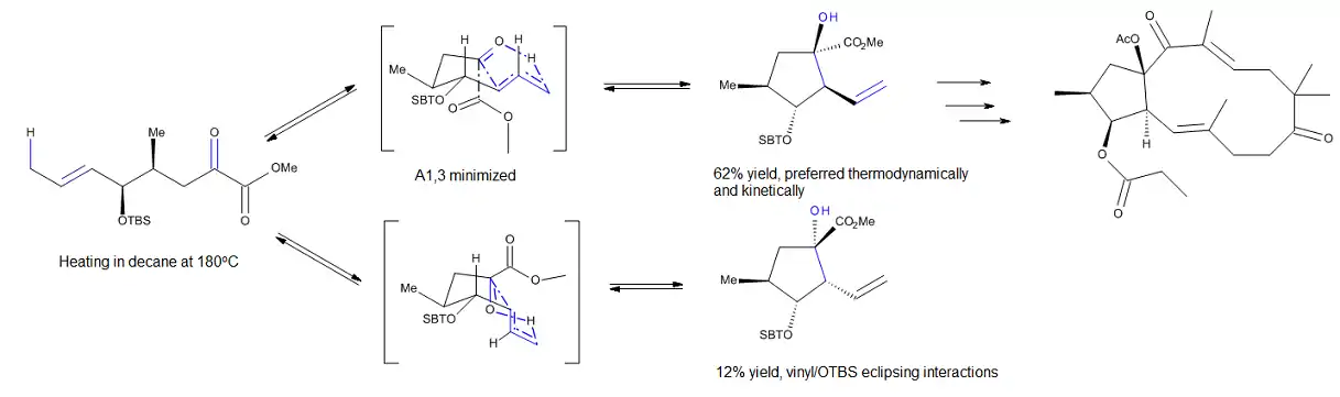 Schnabel e colaboradores[9] tem estudado uma reação carbonilo-eno intramolecular não catalisada, a qual foi usada para preparar o fragmento ciclopentano de jatrofa-5,12-dienos naturais e não naturais, membros da família de moduladores P-glicoproteína. Seus cálculos DFT, teoricamente, para a reação apresentada na Figura 3, propõe que a reação possa prosseguir através de um dos dois estados de transição concertados e do tipo envelope. O desenvolvimento de interações 1,3-transanulares no estado de transição desfavorecido fornece uma boa explicação para a seletividade deste processo.