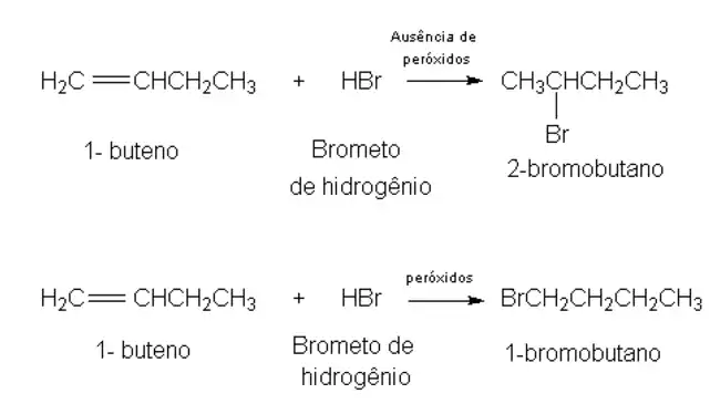 Kharasch e seus colegas descobriram, por exemplo, que 1-buteno cuidadosamente purificado reagiu com brometo de hidrogênio para dar apenas 2-bromobutano - o produto esperado com base na regra de Markovnikov.[4]Por outro lado, quando a mesma reação foi efetuada na presença de um peróxido adicionado, somente 1-bromobutano foi formado.