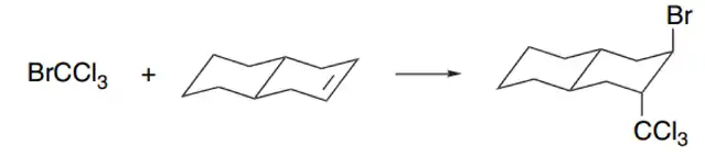 A adição de ciclohexeno com bromotriclorometano dá uma mistura quase 1:1 dos dois estereoisómeros possíveis.[6]