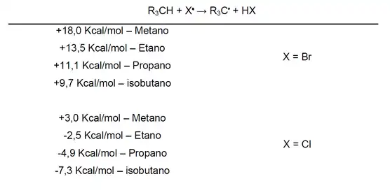 As halogenações radicalares de bromo e cloro com hidrocarbonetos são moderadamente exotérmicas e são possíveis de ocorrer. Com o cloro radicalar a abstração de hidrogênio primário, secundário e terciário são exotérmicas para todos, de modo que, há pouca seletividade na abstração de um hidrogênio secundário ou terciário. A estabilidade do produto radicalar é menos importante para o cloro devido a reação ser muito exotérmica, em comparação ao bromo, não influenciando na energia de ativação.[1]