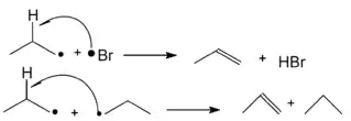 Além dos radicais poderem se combinar, eles podem abstrair o hidrogênio de outro radical formando um alqueno, se um radical propril for desproporcionado por um radical bromo, ou ainda, um alqueno e um alcano, se um radical propil desproporciona outro radical propil ].[1][2]