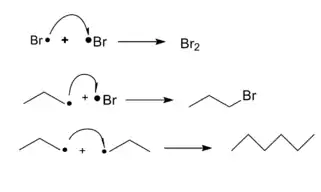 Se dois radicais Br• encontra um ao outro eles podem combinar-se para formar Br2. Da mesma forma, se um Br• encontra um CH3CH2CH2• podem também se combinar. Finalmente,dois radicais propílicos (CH3CH2CH2•), por vezes, encontrar um ao outro, se combinam para dar hexano.[1]