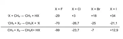 A primeira etapa de propagação é a que determina a velocidade da reação. Ao se comparar a entalpia envolvida nas etapas de propagação, para os diferentes halogênios, observa-se uma grande diferença entre eles. Na tabela a seguir são mostradas as energias liberadas nas etapas de propagação para a halogenação do metano. Podemos observar que a ordem de reatividade na halogenação radicalar se dá por: F2>Cl2>Br2>>I2. Para o flúor esta etapa é a de mais baixa energia de ativação, fazendo com que o flúor seja o halogênio mais reativo, apresentando reações violentas e extremamente exotérmicas (99Kcal/mol), ao ponto de que a fluoração somente ocorre em condições controladas. Por outro lado, a reação de propagação para o iodo é endotérmica (12,9 Kcal/mol), de modo que reação em cadeia não consegue prosseguir.[1][3]
