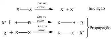 Os alcanos reagem com halogênios mediante mecanismos radicalares. Nesta reação supõe-se que um ou vários hidrogênios do alcano sejam substituídos por halogênios. O mecanismo da halogenação radicalar ocorre por três etapas: iniciação,propagação e terminação. Na iniciação, a molécula do halogênio se rompe de forma homolítica gerando radicais. Na etapa de propagação ocorre a substituição do hidrogênio do alcano por halogênio. Quando os reagentes estão completamente consumidos ou quando já não há excesso do alcano a ser halogenado, os radicais existentes no meio reacional começam a unir-se entre si promovendo a etapa de finalização.[1][2][3]