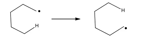 Apesar do fato de que os átomos de hidrogênio não fazem migrações do tipo 1,2, migrações de radicais livres de hidrogênio são conhecidas. Os mais comuns são 1,5 porém migrações mais longas 1,6 também são observadas. A possibilidade de migração de hidrogênio 1,3 tem sido também investigada, porém tal fato não foi confirmado, presumivelmente, a geometria mais favorável para C····H·····C, no estado de transição, é linear e esta geometria não pode ser alcançada em uma migração 1,3. Migrações do tipo 1,4 são conhecidas, mas ainda não muito observadas. Essas migrações longas são mais consideradas como abstrações internas de hidrogênio.[2]