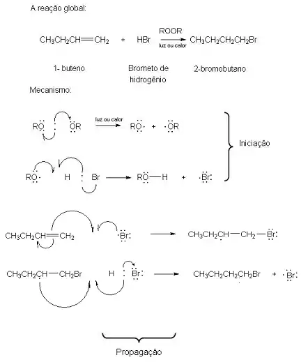 Peróxidos são iniciadores, não são incorporados no produto, mas atuam como uma fonte de radicais necessários para obter a reação em cadeia iniciada. A ligação oxigênio - oxigênio de um peróxido é relativamente fraca , e a adição de radicais livres de brometo de hidrogênio para alcenos começa quando uma molécula de peróxido se rompe, dando dois radicais alcoxi. Um átomo de bromo é gerado no passo 2, quando um desses radicais alcoxi abstrai um átomo de hidrogênio a partir de brometo de hidrogênio. Uma vez que um átomo de bromo se torna disponível, a fase de propagação da reação em cadeia é iniciada. Na fase de propagação, um átomo de bromo é adicionado ao alceno na direção que produz o radical alquila mais estável.[1]