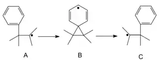 Os grupos arila migram, mas a proposta de que um anel de três membros, como produto intermediário, ainda gera muita controvérsia. Porém a maior parte das evidências indica que B é um estado de transição, não um intermediário. A evidência é à não observação de B quer por ESR ou CIDNP. Ambas as técnicas podem detectar os radicais livres com vidas extremamente curtas.[2]