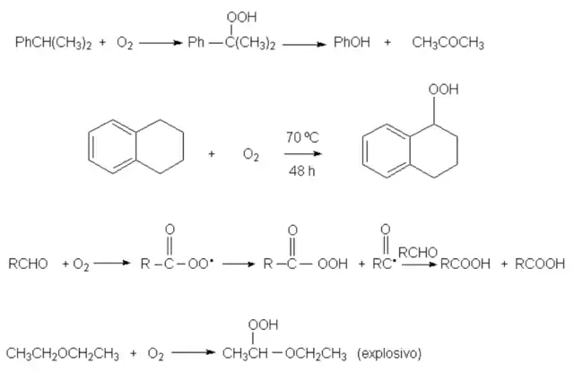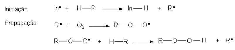 A oxidação em cadeia de moléculas orgânicas por radicais livres através de oxigênio molecular é muitas vezes referida como auto-oxidação. O mecanismo geral é descrito a seguir: