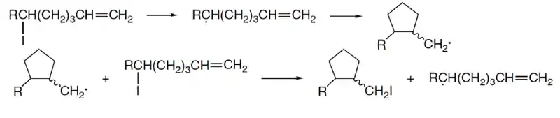 Iodo pode ser usado em processos envolvendo as reações de ciclização como por exemplo os nas reações na formação de derivados de 6-iodohexene. O radical gerado pela abstração do átomo iodo cicliza-se rapidamente para um radical ciclopentilmetilo. A propagação da cadeia é pela transferência de um átomo de iodo.