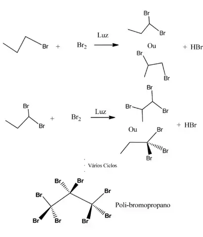 Na reação do propano, o 2-bromopropano é o produto majoritário da reação, pois a velocidade de abstração do hidrogênio secundário é maior que o primário, devido a menor barreira energética existente na remoção do hidrogênio secundário. A 150 °C o rendimento relativo ao 1-bromo-propano é de 8% dos produtos monobromados, enquanto que 2-bromopropano tem um rendimento relativo de 92%. Na reação de bromo radicalar em cadeia, o propano pode sofre mais de uma halogenação. Isso porque nos produtos formados 1-bromopropano e o 2-bromopropano, os 5 hidrogênios remanescentes são tão reativos quanto aqueles do propano. A consequência disso é que a bromação de bromopropano também pode ocorrer gerando dibromopropanos, que por sua vez, também podem gerar tribromopropanos ou até mesmo a substituição de todos os hidrogênios por bromo.[2]