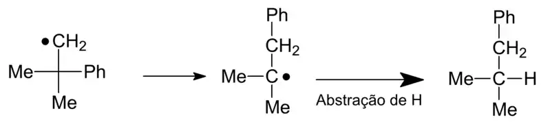 O novo radical livre formado deve se estabilizar por uma nova reação. A ordem da estabilidade de radicais nos leva a prever que, assim como com rearranjos de carbocátion, as migrações devem ocorrer, na ordem de prioridade, no carbono primário<secundário<terciário.[2]