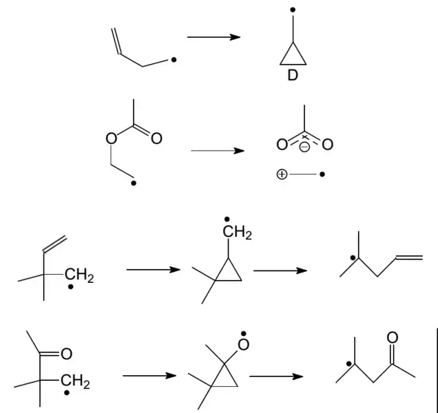 Além do grupo arila, grupos vinílicos e acetoxi também migram. Grupos vinílicos migram através de um de radical ciclopropilcarbinil intermediário (D), enquanto que a migração de grupos acetoxi pode envolver a estrutura de separação de carga imediata.